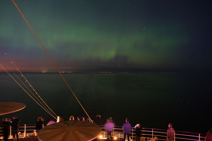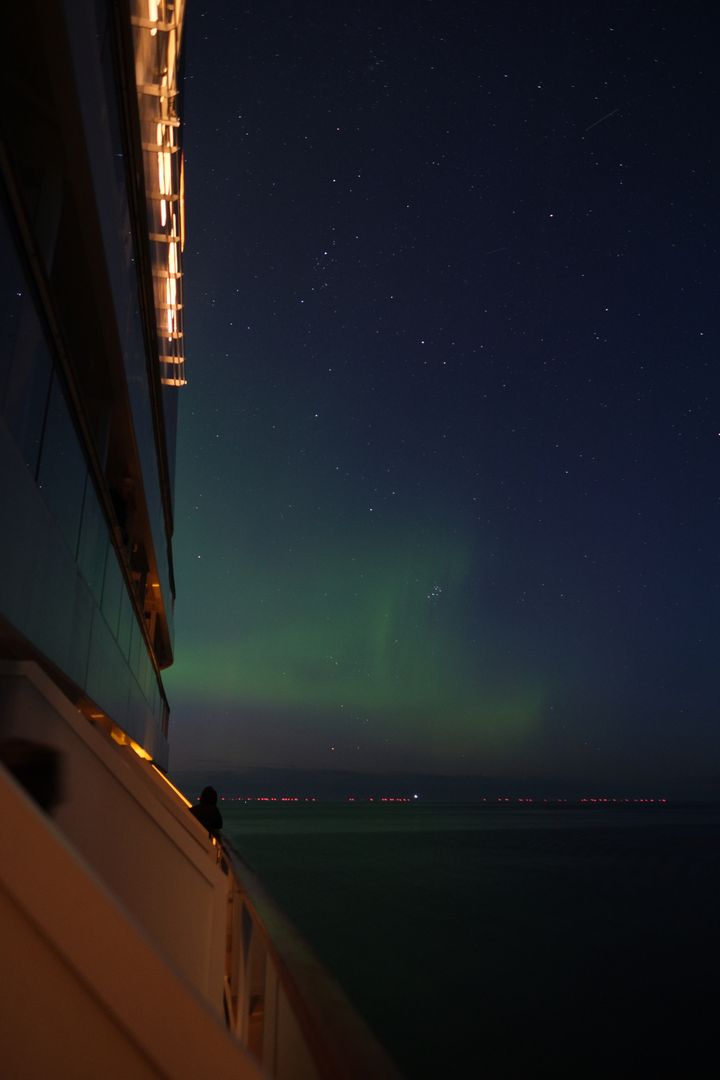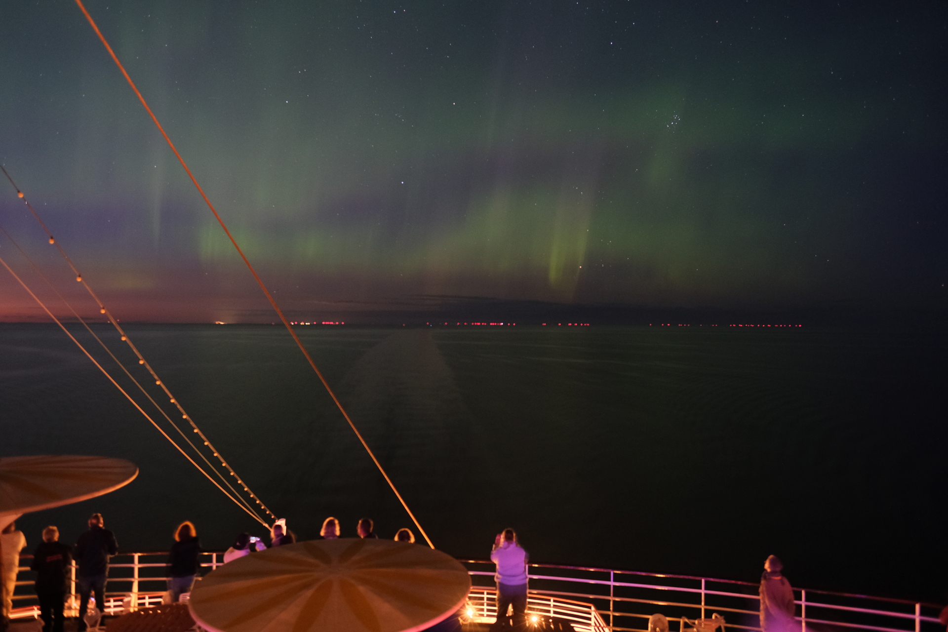 Ein Highlight im wörtlichen Sinne bringt noch die Nacht mit sich. Gegen halb elf werden von der Brücke Polarlichter gemeldet. Wir sind schon in der Kabine, aber die Polarlichter kann man schon vom Balkon aus erkennen. ich packe also nochmal meine Kamera und flitze aufs Oberdeck. Das Spektakel dauert echt lang und die Nordlichter sind auch mit bloßem Auge gut zu sehen. - Damit hatten wir im August nicht gerechnet, dafür aber umso erfreulicher.
